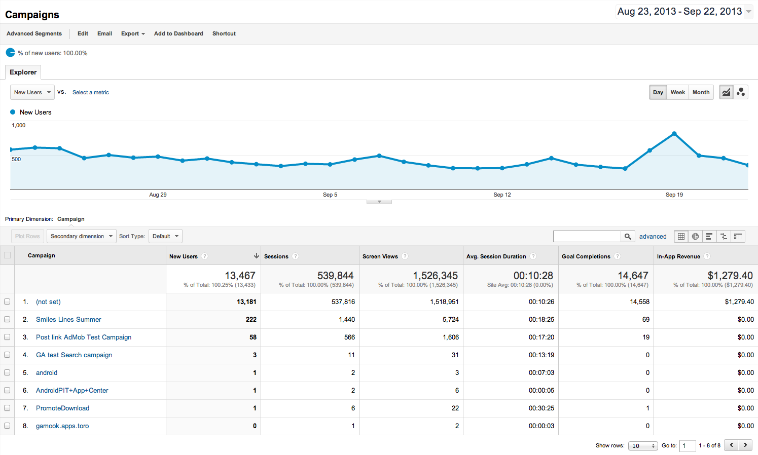• Check the Campaigns report to better understand users being driven into your app, and see how they use your app.
